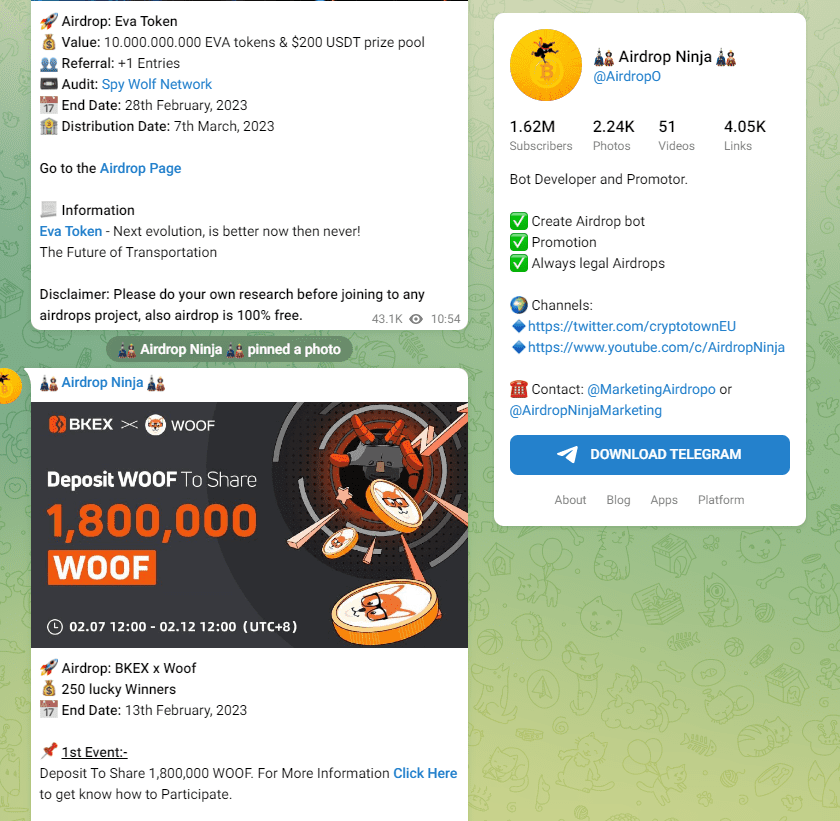 Airdrop Ninja เป็นช่อง Telegram ที่แบ่งปันข้อมูลข่าวสารล่าสุดของการ Airdrop คริปโตต่างๆ รวมไปถึงข้อมูลการเข้าร่วมการ Airdrop นั้นๆ อีกด้วย การ Airdrop นั้นคือกลยุทธ์ทางการตลาดที่บริษัทคริปโตต่างๆ จะแจกคริปโตของโปรเจกต์ของพวกเขาให้ฟรีๆ เพื่อสร้างการรับรู้ถึงโปรเจกต์นั้นๆ ในวงกว้าง โดยปกติแล้ว บริษัทหรือโปรเจกต์ต่างๆ จะขอให้ผู้ใช้งานติดตามข้อมูลข่าวสารจากโปรเจกต์คริปโตบน Twitter, ทำภารกิจต่างๆ หรือถือเหรียญจำนวนหนึ่งไว้ในกระเป๋าเงินเพื่อให้ได้รับสิทธิ์ Airdrop