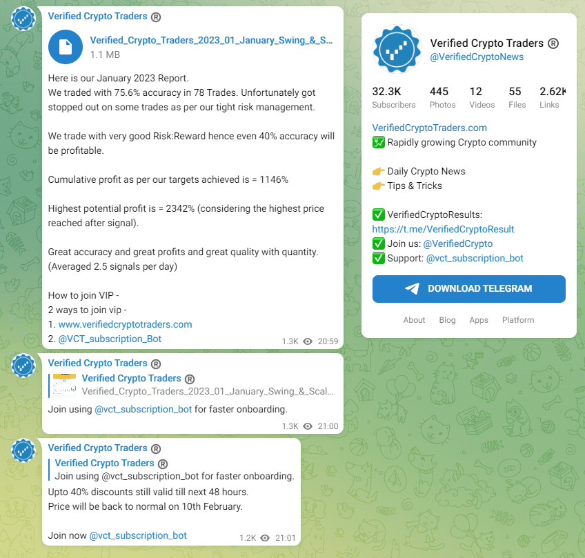 Verified Crypto Traders เป็นอีกหนึ่งชุมชนคริปโตที่มีชื่อเสียงในเรื่องสัญญาณการซื้อขายที่แม่นยำและวิดีโอสอนการซื้อขายบน Youtube พวกเขามีสมาชิกกว่า 30,000 คนที่จะได้รับข่าวสาร, เคล็ดลับ และกลเม็ดต่างๆ ในการซื้อขายคริปโตทุกวัน