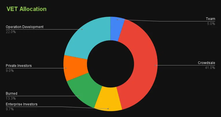 ช่วงแรก VeChain Foundation นั้นพึ่งพา Ethereum ในการเปิดตัวโทเค็น VEN จำนวน 1 พันล้านโทเค็น อย่างไรก็ตาม การเปิดให้สวอปจาก VEN เป็น VET ได้จบลงแล้ว ทำให้ ณ ตอนนี้ มันจะเหลือเพียงโทเค็น VET เพียงเท่านั้น อุปทานโดยรวมในขณะนี้อยู่ที่เกือบ 8.6 หมื่นล้าน