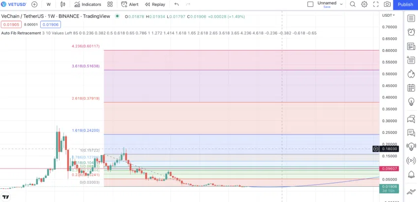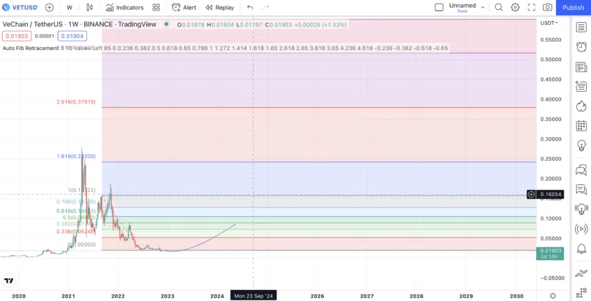 ดังนั้น ในอีกไม่กี่ปีข้างหน้า โดยเฉพาะอย่างยิ่งในปี 2026-2027 เราคาดว่า VET จะทำลายสถิติสูงสุดตลอดกาลได้ ทุกๆ ปี จุดต่ำสุดอาจจะอยู่ที่ระดับ Fib Retracement จากที่คาดการณ์ไว้โดยใช้ตัวชี้วัดระดับ Fib Retracement