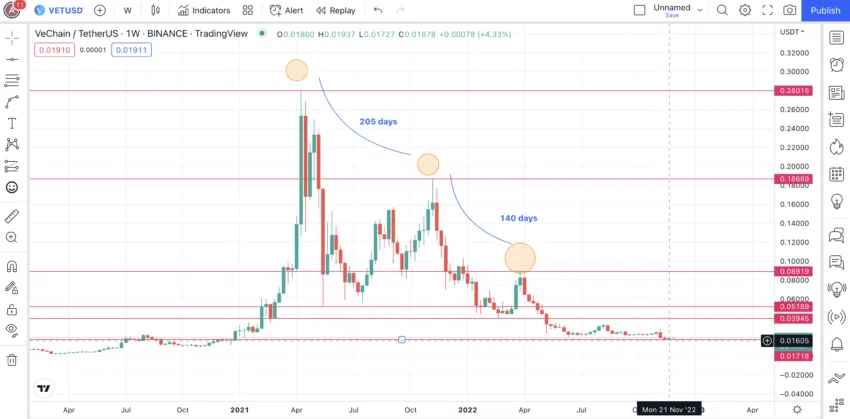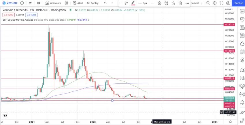 ณ ช่วงเวลาที่เขียนบทความ VET ซื้อขายอยู่ที่ 0.01903 ดอลลาร์ ต่ำกว่าเส้นค่าเฉลี่ยเคลื่อนรายสัปดาห์ที่ 50 และ 100 สัปดาห์ ดังนั้น หากจุดสูงสุดครั้งถัดไปที่ 0.0511 ดอลลาร์เกิดขึ้น เราคาดว่าความเคลื่อนไหวครั้งต่อไปจะสูงขึ้น