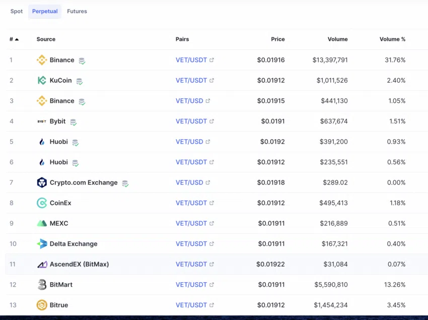คู่ VET/USDT ของ Binance นั้นมีปริมาณการซื้อขายสูงสุด ตามมาด้วยคะแนนสภาพคล่องและความเชื่อมั่นของนักเทรดที่ยอดเยี่ยม