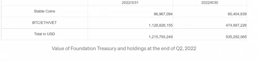 - มูลค่ารวมของสินทรัพย์ที่ถือครองโดย VeChain Foundation ลดลง 44% เมื่อเทียบกับไตรมาสที่ 1 ปี 2022