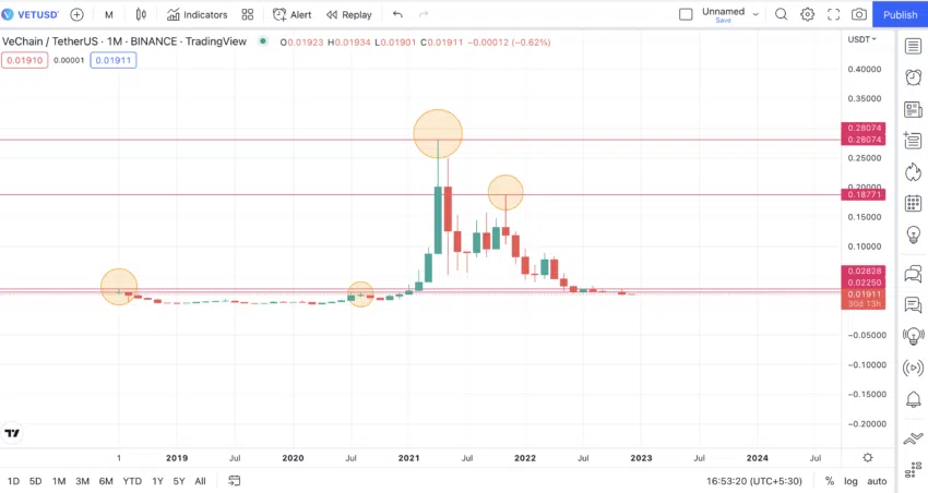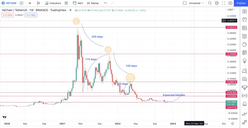 หากแนวโน้มของตลาดซื้อขายของ VET แบบเดิมยังคงดำเนินต่อไป เราคาดว่าราคา 0.0511 ดอลลาร์ในเดือนมีนาคม 2023 จะกลายเป็นจุดสูงสุด สำหรับจุดต่ำสุด จุดต่ำสุดที่ 4 อาจจะลดลง 40% (เฉลี่ย 23% และ 57% จากช่วงที่ 2) จากระดับต่ำสุดก่อนหน้านี้ที่ 0.0171 ดอลลาร์