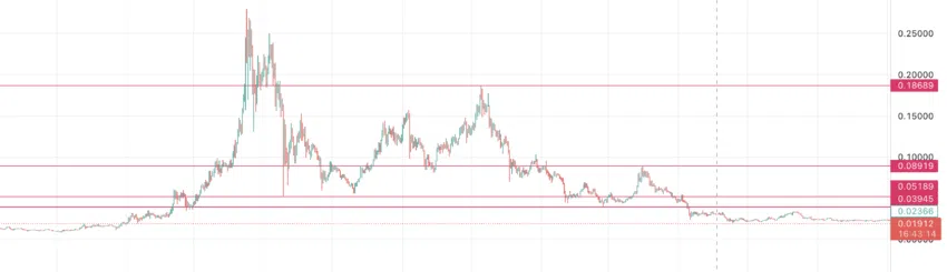 ระดับ Fibonacci Retracement จะแสดงให้เราเห็นถึงระดับแนวต้านและแนวรับที่สำคัญ ที่ระดับ 0.089 ดอลลาร์จะสอดคล้องกับระดับ Fib 50% จากการคาดการณ์ของเรา คาดว่ามันจะไปถึงภายในปี 2024