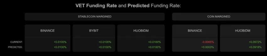 ในตอนนี้ กระดานเทรดส่วนใหญ่มี Funding Rate เป็นบวก แต่อย่างไรก็ตาม ค่าการเพิ่มขึ้นนั้นน้อยมาก ดังนั้น VET อาจจะทำการซื้อขายอยู่ในกรอบราคาเดิมๆ ไปซักช่วงระยะหนึ่ง
