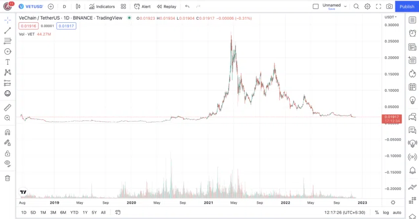 ตอนนี้ เราจะมาดูกันที่กราฟราคา, รูปแบบ, และตัวชี้วัดต่างๆ ของ VET กัน แต่ก่อนอื่น นี่คือมุมมองของกราฟรายวันในภาพกว้างของ VET ตั้งแต่มันเริ่มเปิดตัว