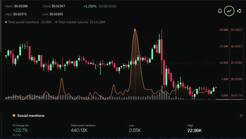 คุณจะเห็นได้ว่า ราคา VET จะไหวทุกครั้งที่มีการกล่าวถึงในโลกโซเชี่ยล หลังจากวันที่ 28 ตุลาคม 2022 ราคาของมันก็ทำจุดสูงสุดใหม่อย่างรวดเร็ว การถูกกล่าวถึงในโลกโซเชี่ยลที่เพิ่มมากขึ้นในช่วงเวลาดังกล่าวก็อันเนื่องมาจากการที่ชุมชน VeChain มีความคาดหวังต่อการประกาศอัพเดต PoA 2.0