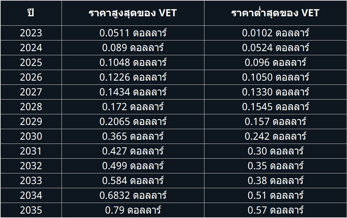 ภายในปี 2035 การคาดการณ์ราคา VET ระบุว่ามูลค่าของโทเค็น VET จะขึ้นไปอยู่สูงกว่า 0.51 ดอลลาร์ และหากมีการยอมรับการใช้งานในวงกว้าง มันอาจจะทำให้ราคาขึ้นไปได้สูงถึง 0.60 ดอลลาร์ในช่วงเวลาเดียวกัน อย่างไรก็ตาม หากเราพิจารณาถึงตลาดซึ่งจะมีรอบการวิ่งขาขึ้นหลายครั้ง เราอาจจะได้เห็นราคาสูงสุดของ VET อยู่ที่ 0.79 ดอลลาร์ได้