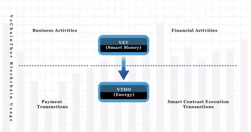 โทเค็น VET เป็นส่วน Smart Money ของระบบนิเวศ VeChain ในขณะที่ VTHO — โทเค็นที่ 2 ของโครงสร้างพื้นฐานของเศรษฐกิจแบบโทเค็นคู่ — จะถูกใช้จ่ายเป็นค่าพลังงานของเครือข่าย