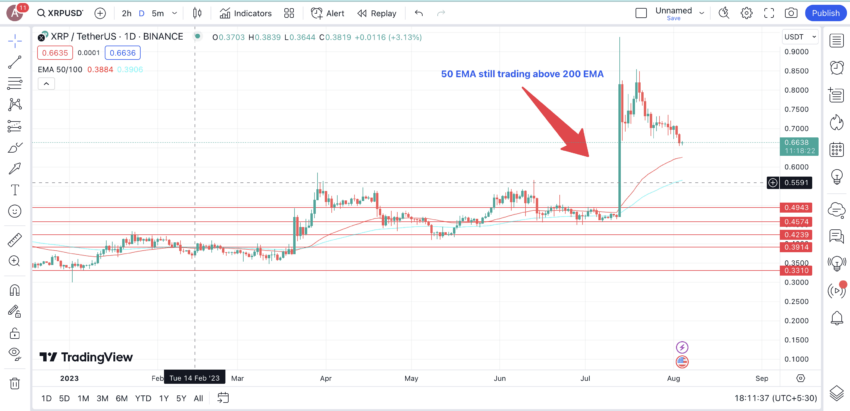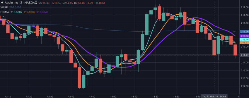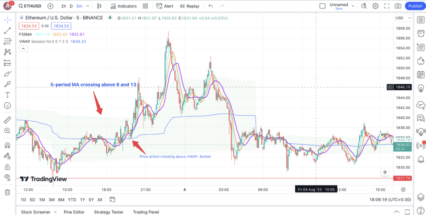 หากมันเกิดขึ้น การเคลื่อนไหวอยู่เหนือเส้น VWAP จะเป็นการยืนยันถึงสัญญาการเทรดที่แข็งแกร่ง อย่างไรก็ตาม สิ่งที่ตรงกันข้ามกันจะเกิดขึ้นเมื่อเส้น 5-Period EMA วิ่งตัดลงต่ำกว่าเส้นอื่นๆ ซึ่งจะเกิดขึ้นเมื่อราคาอยู่ต่ำกว่าเส้น VWAP เท่านั้น