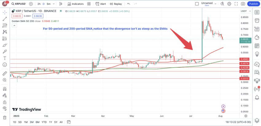 - เพื่อการตรวจสอบยืนยันเพิ่มเติม คุณสามารถเพิ่มเส้น 200-Period และ 50-Period EMA ลงไปบนกราฟได้