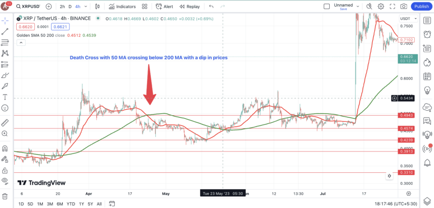 สิ่งที่ตรงกันข้ามกับเหตุการณ์ที่กล่าวมาก่อนหน้านี้ จะถูกเรียกว่า Death Cross ซึ่งจะเป็นการที่เส้น MA ในระยะยาววิ่งตัดผ่านเส้น MA ในระยะสั้นลงมา แสดงให้เห็นถึงแนวโน้มของขาลง ซึ่งอาจจะเป็นตัวเลือกที่ดีในการขายสินทรัพย์ออกไป