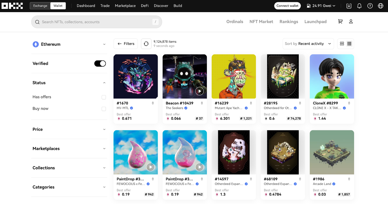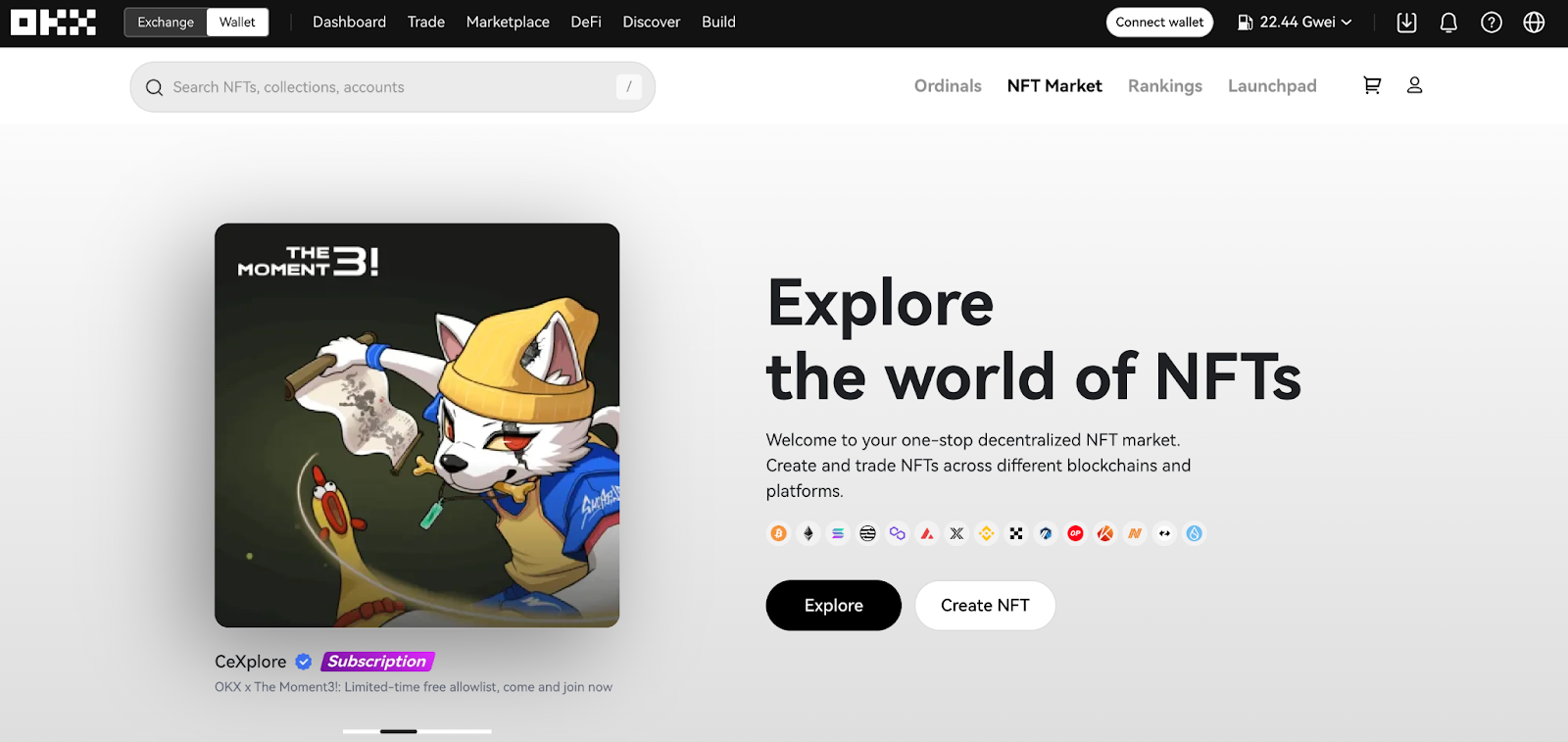 ตลาดซื้อขาย NFT ของ OKX คือจุดหมายปลายทางที่โดดเด่นสำหรับการซื้อขาย NFT Trading Cards แพลตฟอร์มของพวกเขาสามารถเชื่อมต่อกับเครือข่ายบล็อกเชนได้มากกว่า 11 เครือข่าย ซึ่งรวมไปถึงเครือข่ายยอดนิยม เช่น Ethereum, Solana และ Binance Smart Chain ฯลฯ และยังได้รวบรวมเอาคอลเล็กชั่นต่างๆ มาจากตลาดซื้อขายชั้นนำมากมาย ไม่ว่าจะเป็น Opensea หรือ LooksRare เป็นค้น แพลตฟอร์มนี้จะช่วยให้คุณซื้อ ขาย และแลกเปลี่ยนคอลเล็กชั่น NFT ของคุณได้อย่างราบรื่น