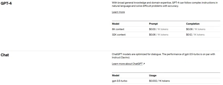 สำหรับ OpenAI APIs มีตัวเลือกให้เลือกอยู่ 2 ตัวในขณะที่เขียนบทความนี้ — 8,000 บริบท และ 32,000 บริบท ดังที่เห็นได้ในภาพด้านล่าง ราคาจะขึ้นอยู่กับรุ่นที่คุณเลือกและอาจจะแพงมากหากคุณไม่ระวังให้ดี เราจะมาพูดคุยกันในเรื่องข้อเสียเหล่านี้โดยละเอียดในภายหลัง