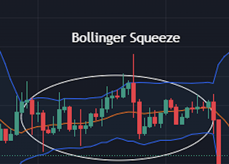 ในการเทรด Squeeze นักเทรดอาจเปิด short หลังราคาพุ่งดิ่งลงและตั้ง SL ไว้เหนือจุดที่ breakout ลงมา การตั้ง TP สามารถทำได้หลายแบบ ในภาพดังกล่าว คือนำแนวคิด Walk the Band มาใช้ และเมื่อราคาเริ่มอ่อนแรงลงกลับเข้ามาในกรอบก็เลือกปิดสถานะ