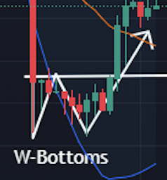 W-Bottoms เป็นกลยุทธ์สวนเทรน (Trend Reversal) โดยคาดหวังว่าราคากำลังจะกลับตัว เพราะทำการทดสอบแนวรับมาแล้วถึง 2 ครั้ง คล้าย Double Bottom ในแพทเทิร์นทั่วไป แต่เราสามารถพิจารณาการเปลี่ยนแปลงไปของกรอบบนและล่างได้เพิ่มเติม ว่ามีลักษณะออกข้างหรือไม่ เพื่อยืนยันว่าสภาวะตลาดเริ่มชะลอตัวลงแล้วจริง โดยแบ่งลำดับเหตุการณ์ได้ดังนี้