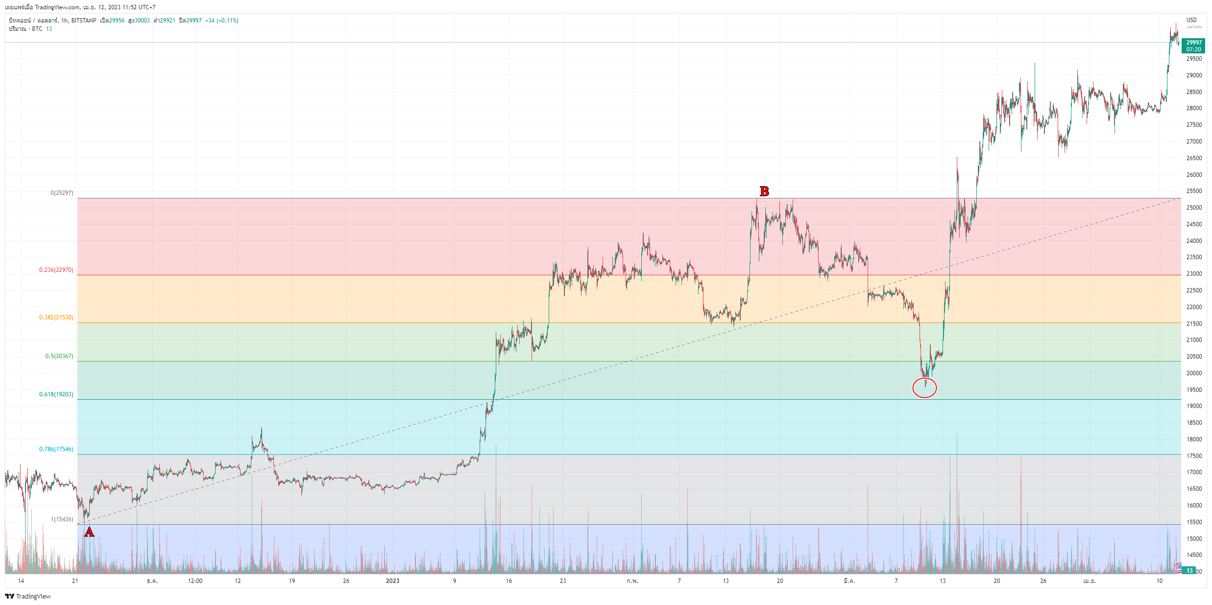 จากรูปตัวอย่าง เราจะเห็นได้อย่างชัดเจนว่า เมื่อราคาของ BTC ลดลงมา(เกือบ)อยู่ที่ระดับ 0.618 ราคาของมันก็ได้มีการเด้งกลับขึ้นไป ตามทฤษฏีที่ว่าราคาสินทรัพย์มีโอกาสที่จะกลับตัวในระดับดังกล่าวซึ่งเป็นระดับ Fibonacci Retracement ที่สำคัญ