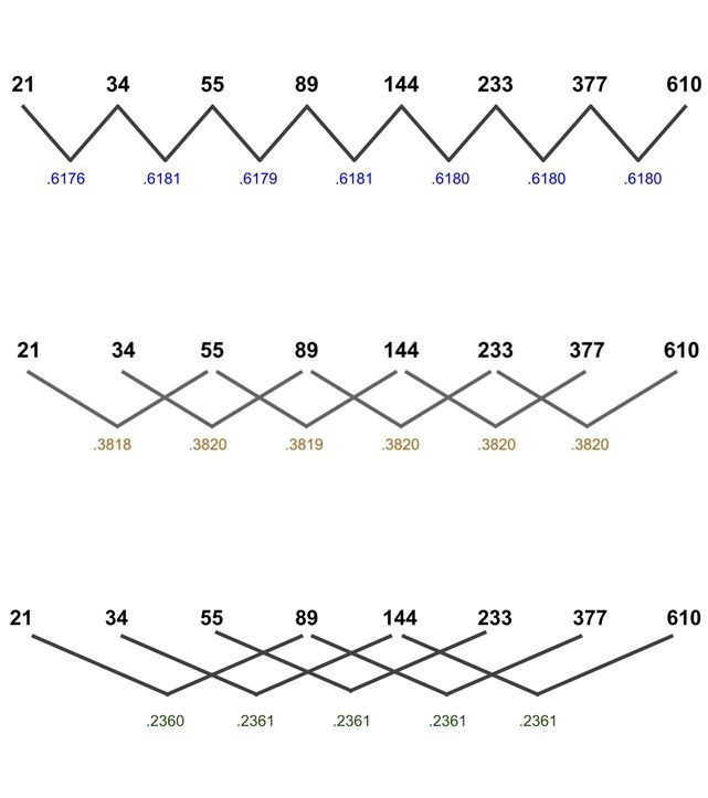เช่น ถ้าเราเอาเลขมากหารเลขน้อยก่อนหน้า เช่น 21÷13 จะได้ 1.625 และถ้าเราเอาเลขใหญ่มากขึ้นมาทำแบบเดียวกัน เช่น 144÷89 จะเท่ากับ 1.618 ซึ่งพอมีนักคณิตศาสตร์พยายามทดลองจะเห็นว่ายิ่งเอาเลขมากหารเลขน้อยไปเรื่อยๆ จะได้เข้าใกล้ค่า 1.618 ขึ้นเรื่อยๆ