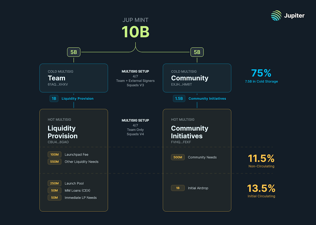 - อุปทานหมุนเวียนเริ่มต้น: 1,350,000,000 JUP (13.5%)