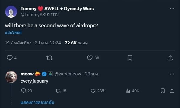 - 40% จะถูกแจกจ่ายให้กับคอมมูนิตี้เท่าๆ กันผ่านการ Airdrop เป็นจำนวน 4 รอบ (มีการบอกใบ้เป็นนัยๆ จากผู้ก่อตั้งว่าเหรียญ JUP จะมีการ Airdrop ทุกๆ เดือนมกราคมของทุกปีหลังจากนี้)