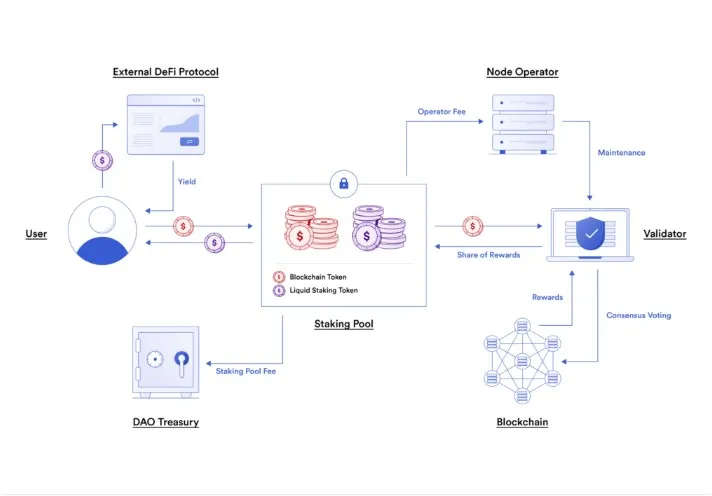 ด้านล่างนี้คือ แผนภูมิโปรโตคอล Liquid Staking ที่แสดงให้เห็นว่า LST สามารถใช้ในโปรเจกต์ DeFi อื่นๆ ได้อย่างไร