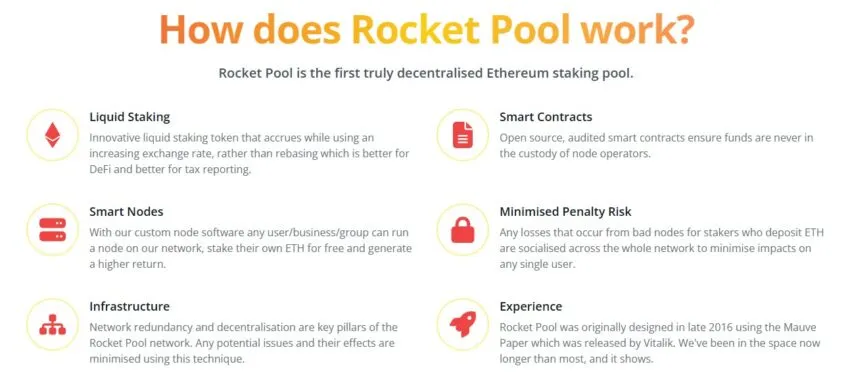 อีกหนึ่งในตัวเลือกที่ยอดเยี่ยมคล้ายกับ Lido ได้แก่ Rocket Pool ซึ่งเป็นแพลตฟอร์มแบบกระจายอำนาจที่สามารถ Staked เหรียญ ETH ได้ Rocket Pool เปิดตัวในปี 2016 และช่วยให้ผู้ใช้งานสามารถ Stake และใช้งาน Permissionless Node ได้ ฟีเจอร์นี้จะช่วยให้คุณสามารถ Stake ด้วยจำนวนที่น้อยกว่า 32 ETH ได้ ในขณะที่ยังสามารถรับรางวัล Staking ได้สูงสุดถึง APR 8.98% พร้อมกับหลักประกัน RPL สำหรับการรักษาความปลอดภัยแพลตฟอร์ม หรือคุณสามารถใช้บริการ Liquid Staking เพื่อ Stake เหรียญ ETH และรับ rETH (ซึ่งเป็น Liquid Staking Tokens) พร้อม APR 3.15% (อิงจากค่าเฉลี่ย 7 วัน)