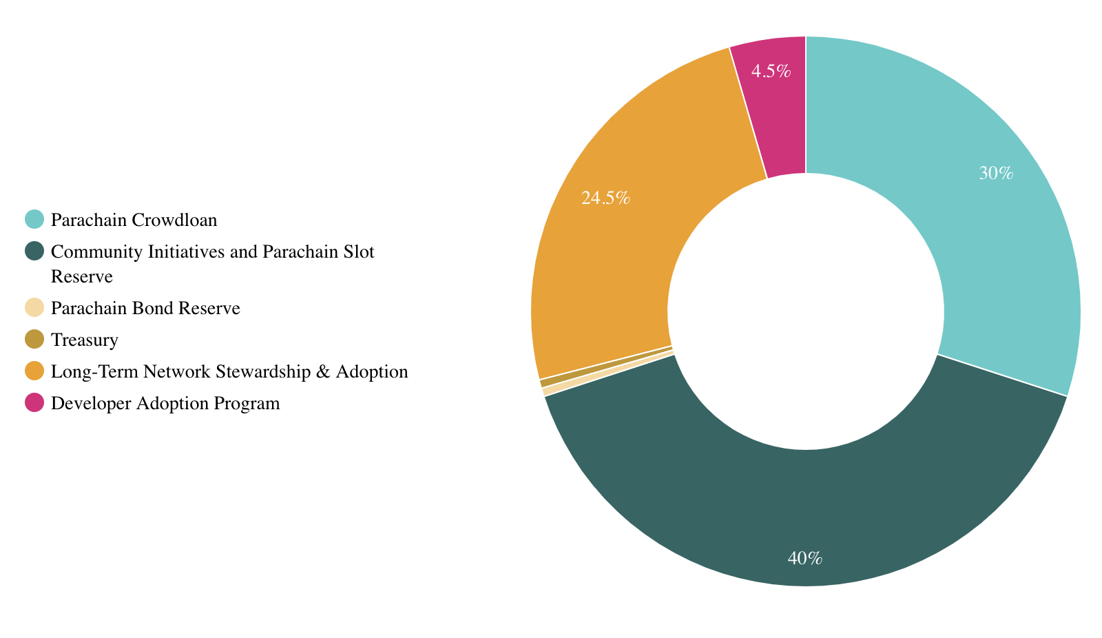 - 30% ให้กับ Parachain Crowdloan: โทเค็นในส่วนนี้จะถูกนำไปใช้สำหรับการระดมทุนเพื่อเช่าสล็อต Parachain ในช่วง 48 สัปดาห์แรกในปีแรก โดย 30% ของทั้งหมดจะถูกแจกจ่ายให้กับผู้ที่มีส่วนร่วมในทันที และอีกทั้งหมด 70% จะถูกทยอยแจกจ่ายให้ทุกๆ สัปดาห์ตลอดสัญญาเช่าสล็อต Parachain เป็นเวลา 48 สัปดาห์