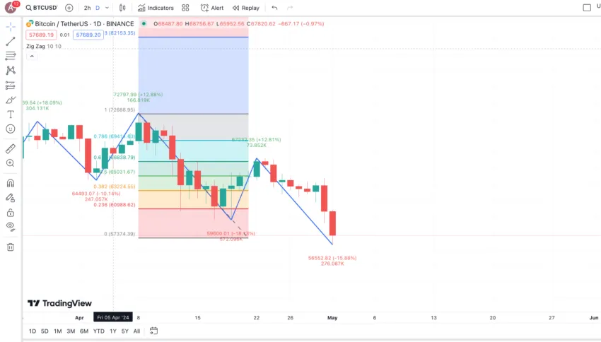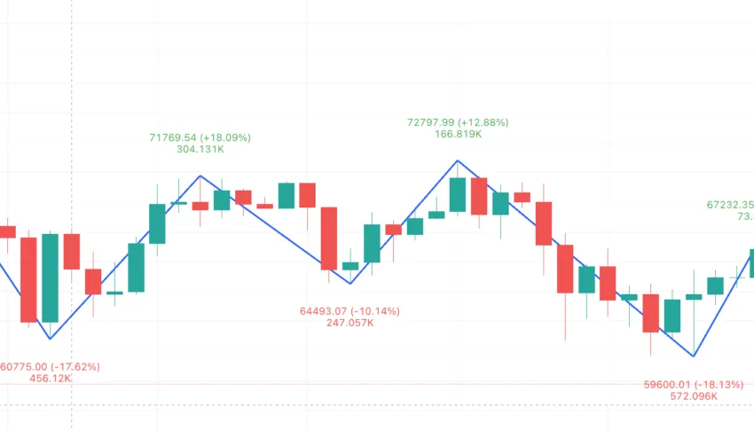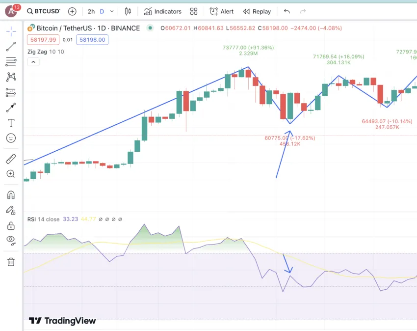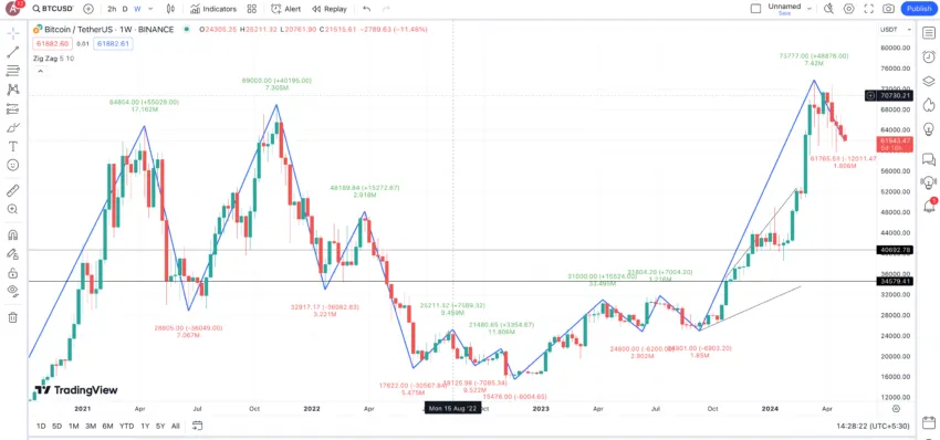 หลักๆ แล้ว อินดิเคเตอร์ ZigZag นั้นเป็นเส้นตรง ดังนั้น คุณสามารถใช้มันเพื่อระบุรูปแบบกราฟแบบคลาสสิกได้ เช่น รูปแบบ Double Tops, Head and Shoulders, Triangles และอื่นๆ อีกมากมาย ด้านล่างนี้เป็นกราฟที่แสดงรูปแบบ Double Top ที่ใกล้เคียงกับระดับ 72,000 ดอลลาร์ ทั้ง 2 ครั้ง ซึ่งแสดงให้เห็นว่า ตลาดกระทิง BTC ยังขาดความแข็งแกร่ง ซึ่งนำไปสู่การปรับฐานราคาครั้งใหญ่