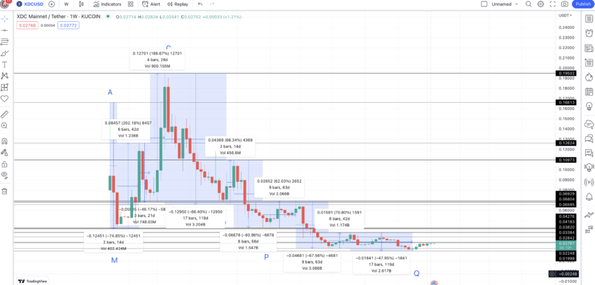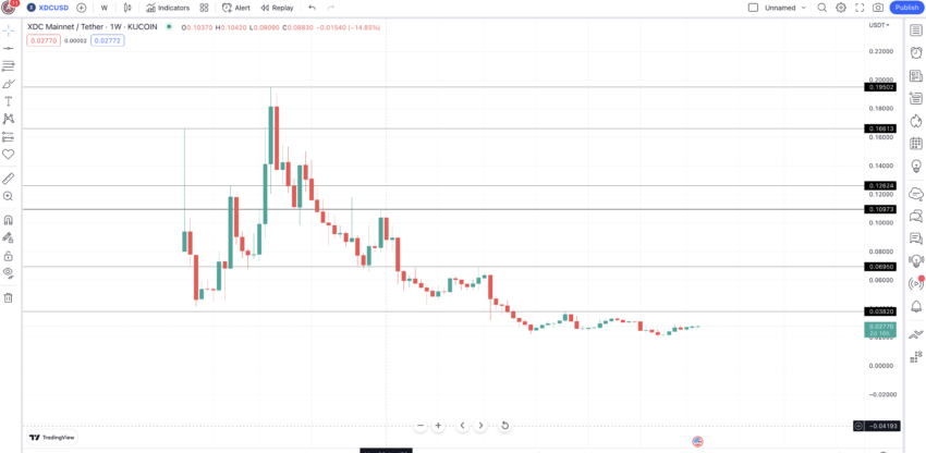 ราคาของ XDC เริ่มต้นด้วยจุดสูง จากนั้นก็ทำจุดสูงอีกครั้ง ก่อนที่จะไปถึงจุดสูงสุดที่ 0.1939 ดอลลาร์ จากจุดนั้น ราคาของ XDC กลายเป็นขาลงอย่างชัดเจน ซึ่งบ่งบอกได้จากจุดสูงที่ต่ำลงทั้งหมดที่เกิดขึ้น