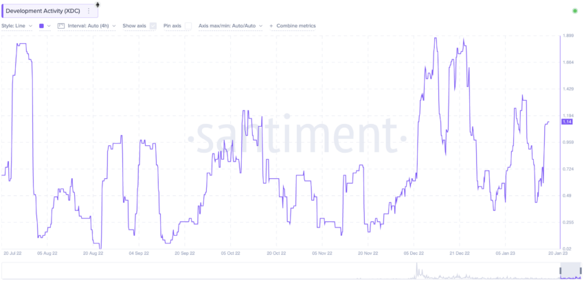 กิจกรรมการพัฒนาของ XDC แสดงให้เห็นว่าตัวเลขต่างๆ นั้นลดลงในช่วงเดือนมกราคม 2023 เมื่อเทียบกับจุดสูงสุดในเดือนธันวาคม กิจกรรมการพัฒนานั้นอยู่ในระดับต่ำ แต่ก็มีสัญญาณของการขยับขึ้น ซึ่งบ่งบอกถึงการยอมรับของเครือข่ายที่เพิ่มมากขึ้น