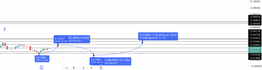 เรามีจุดต่ำสุดท้ายที่จุด Q สมมุติว่าเราได้จุดสูงสุดถัดไป ซึ่งตามข้อมูลย้อนหลัง จุดดังกล่าวจะอยู่ที่ 0.0325 ดอลลาร์ ขอให้สังเกตว่าจุดสูงสุดนี้ยังคงอยู่ต่ำกว่าจุดสูงล่าสุดหรือจุด F ซึ่งหมายความว่า ถึงแม้จะเข้าสู่ช่วงต้นปี 2023 เราคิดว่าแนวโน้มขาลงก็จะยังคงดำเนินต่อไป