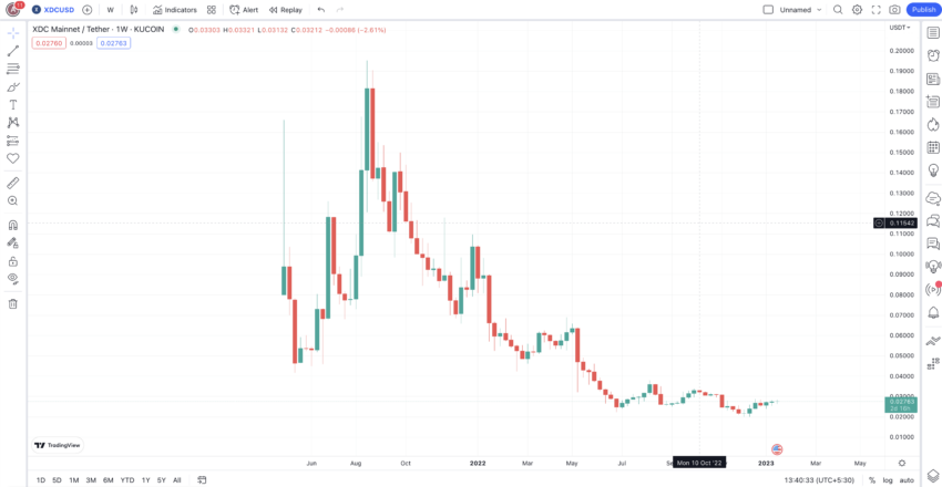 ราคาสูงสุดของเหรียญ XDC นั้นอยู่ที่ 0.1939 ดอลลาร์ ซึ่งเกิดขึ้นเมื่อวันที่ 21 สิงหาคม 2021
