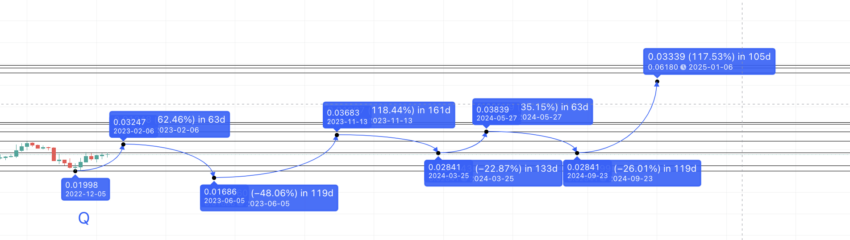ที่จุดต่ำสุดในปี 2023 — 0.0169 ดอลลาร์ — เราคาดว่า XDC จะเกิดแรงกดดันในการขายครั้งใหญ่ หลังจากนี้ เราคาดว่าจุดสูงจะเป็นไปตามค่าเฉลี่ยจากจุดต่ำไปสูง จุดสูงถัดไปจะเพิ่มขึ้นที่ 117.60% อย่างไรก็ตาม เราคิดว่ากรอบเวลานั้นจะแตกต่างออกไป มันเป็นเรื่องยากที่จะกำหนดจุดที่แน่นอนของจุดสูงหรือจุดต่ำ