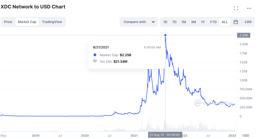 ตอนนี้ เราจะมาดูกันที่มูลค่าตลาดและปริมาณการซื้อขายของ XDC กัน เมื่อเปรียบเทียบกับจุดสูงสุดของมันแล้ว ตัวเลขของค่าดังกล่าวลดลงเป็นอย่างมาก จุดสูงสุดของมูลค่าตลาดของ XDC นั้นอยู่ที่ 2.25 พันล้านดอลลาร์ในวันที่ 21 สิงหาคม 2021 และปริมาณซื้อขายในวันนั้นอยู่ที่ 21.34 ล้านดอลลาร์ อย่างไรก็ตาม ณ วันที่ 16 มกราคม 2023 ปริมาณการซื้อขายลดลงมาอยู่ที่ 2.85 ล้านดอลลาร์ และมูลค่าตลาดก็ลดลงมาอยู่ที่ 338.47 ล้านดอลลาร์