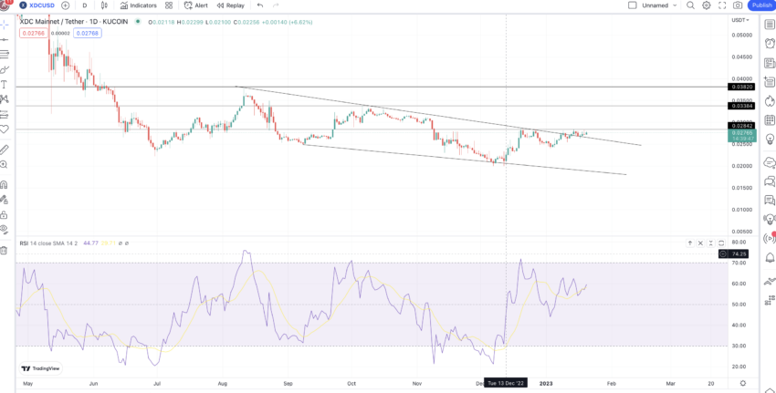ตัวชี้วัดโมเมนตัมหรือ RSI จะต้องเคลื่อนที่ขึ้นไปอยู่เหนือจุดสูงสุดสุดท้ายบางจุดเพื่อทำให้เกิดการพุ่งขึ้นของราคาในระยะสั้น ณ วันที่ 27 มกราคม 2022 XDC ซื้อขายอยู่ที่ 0.0276 ดอลลาร์ การทะลุเส้นแนวโน้มด้านบนขึ้นไปจะทำให้มันสามารถขึ้นไปสู่ระดับแนวต้านที่ 0.028, 0.0338 หรือแม้กระทั่ง 0.0382 ดอลลาร์ได้ ดังนั้น ในสภาวะตลาดที่เหมาะสม XDC มีโอกาสพุ่งทะลุจุดสูงที่เกิดขึ้นล่าสุดได้