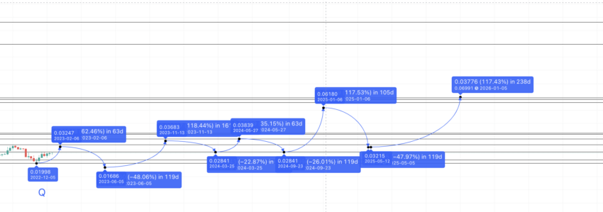 แต่ก่อนอื่น เราต้องค้นหาจุดต่ำสุด หลังจุดสูงสุดปี 2025 จากตารางข้อมูลจุดสูงไปต่ำ เราสามารถคาดถึงการปรากฏขึ้นของจุดต่ำสุดถัดไปได้ใน 119 วัน (ช่วงระยะเวลาสูงสุด) และลดลงราวๆ 48% (จากตารางข้อมูลข้างต้น) แต่มีสิ่งที่ต้องสังเกตอยู่