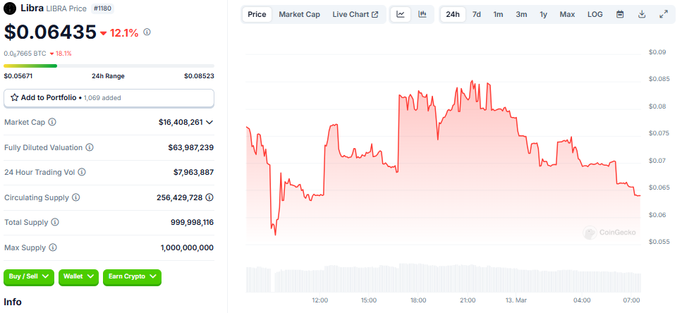 ข้อมูลบน CoinGecko แสดง ว่า LIBRA memecoin กำลังซื้อขายที่ USD0.06435 ณ เวลาที่เขียนนี้ ลดลงกว่า 12% ใน 24 ชั่วโมงที่ผ่านมา
