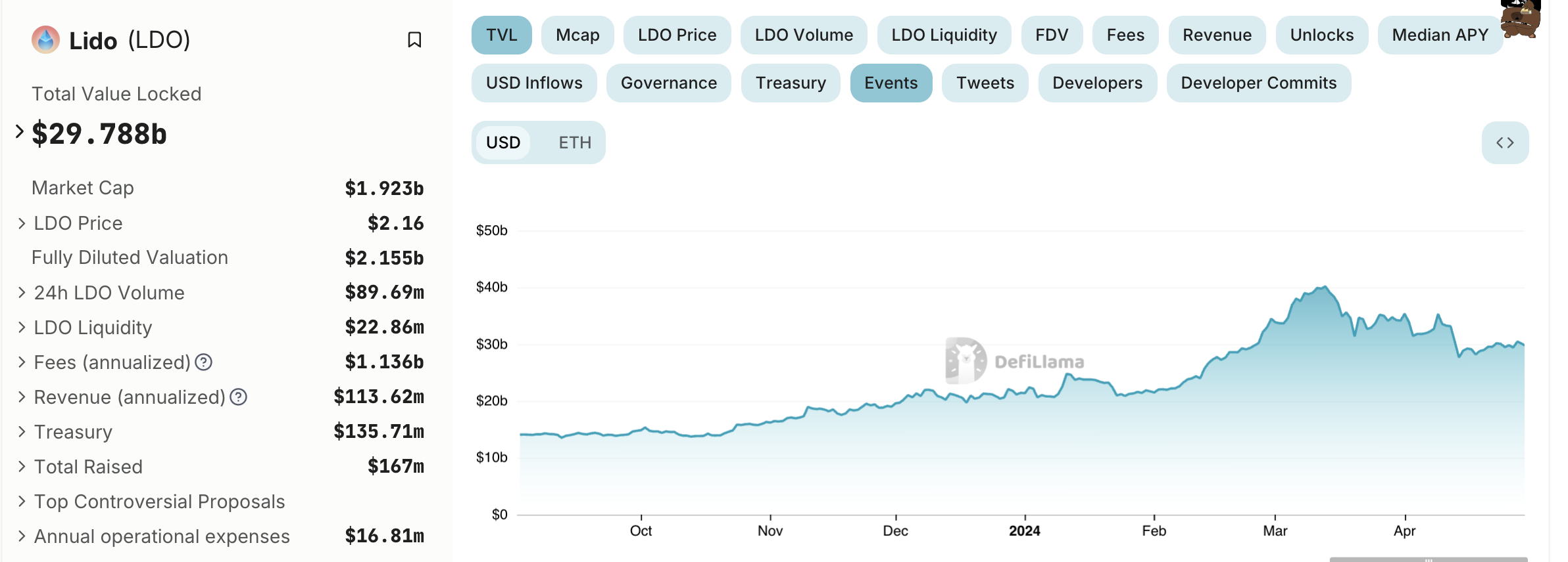 แม้จะมีจุดสังเกตนี้ แต่มูลค่ารวมของ Lido ที่ถูกล็อค (TVL) ก็ลดลงอย่างเห็นได้ชัด จากจุดสูงสุดที่ 40.16 พันล้านดอลลาร์ในช่วงกลางเดือนมีนาคม ลดลงเหลือ 29.78 พันล้านดอลลาร์ ซึ่งลดลงประมาณ 25%