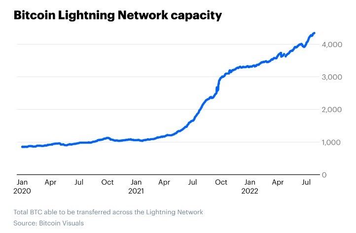 จากข้อมูลของ Arcane Research พบว่า การชำระเงินในไตรมาสที่ 1 ปี 2022 มีการชำระเงินโดย Lightning แล้วกว่า 20-30 ล้านดอลลาร์ต่อเดือน ซึ่งนับว่าเป็นการเติบโตกว่า 4 เท่า หากเทียบปีต่อปี อย่างไรก็ตามมันยังเล็กมากหากเทียบกับจำนวนเงินกว่า 866 พันล้านดอลลาร์ต่อเดือนของระบบ Visa