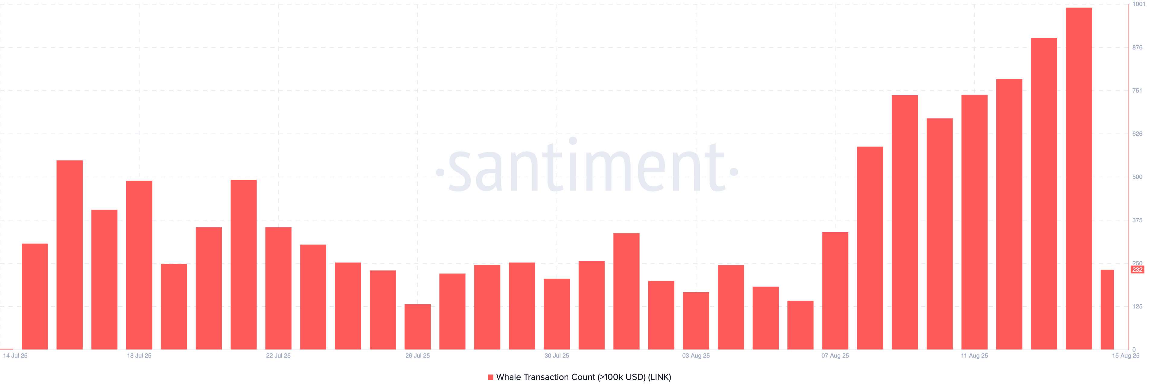 ข้อมูลบนเครือข่ายแสดงให้เห็นว่าจำนวนธุรกรรมของวาฬ LINK ที่เกิน 100,000 USD พุ่งขึ้นสู่ จุดสูงสุดในรอบเจ็ดเดือน ที่ 992 รายการในวันพฤหัสบดี