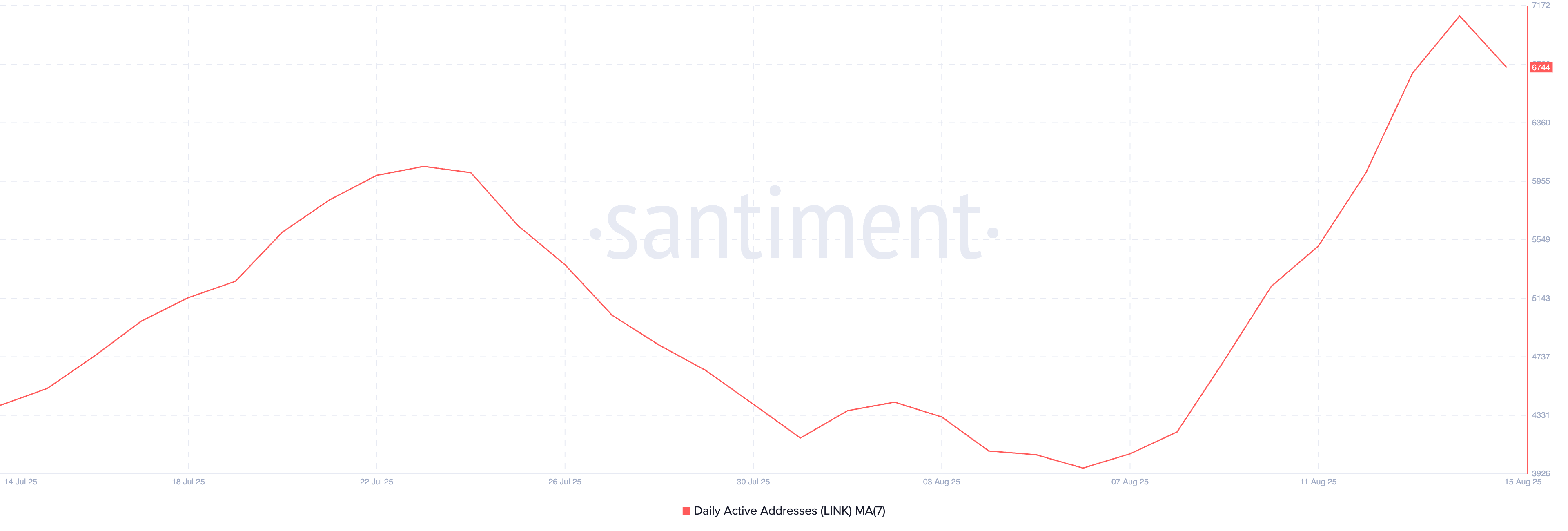 นอกจากนี้ จำนวนที่อยู่ที่ใช้งานรายวันในการซื้อขาย LINK ก็มีแนวโน้มเพิ่มขึ้นเช่นกัน ซึ่งบ่งชี้ถึงการมีส่วนร่วมบนเครือข่ายที่เพิ่มขึ้น ตามข้อมูลจาก Santiment ซึ่งสังเกตโดยใช้ค่าเฉลี่ยเคลื่อนที่เจ็ดวัน เพิ่มขึ้น 55% ตั้งแต่ต้นเดือนสิงหาคม