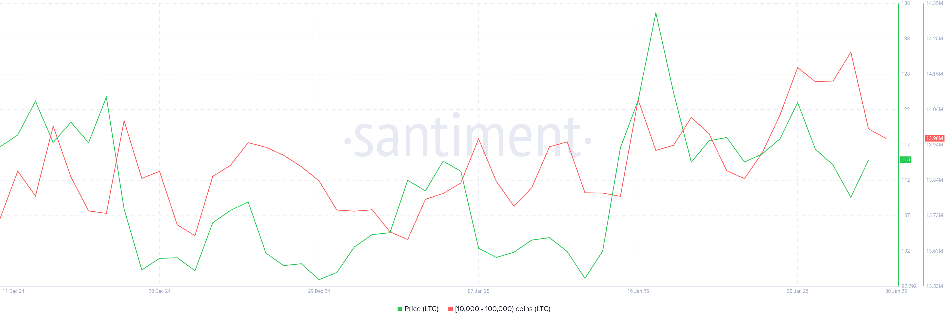 กิจกรรมของวาฬบ่งบอกถึงการระมัดระวังท่ามกลางการพุ่งขึ้นของราคา ข้อมูลบนเครือข่ายเผยว่า ที่อยู่ของ Litecoin ที่ถือระหว่าง 10,000 ถึง 100,000 LTC ได้ขายโทเคนกว่า 230,000 โทเคน มูลค่าประมาณ 30 ล้าน USD ภายใน 24 ชั่วโมง ผู้ถือครองรายใหญ่เหล่านี้ หรือวาฬ กำลังใช้ประโยชน์จากความตื่นเต้นที่เกิดจาก ETF เพื่อทำกำไร ซึ่งบ่งชี้ถึงความผันผวนของราคาในระยะสั้น