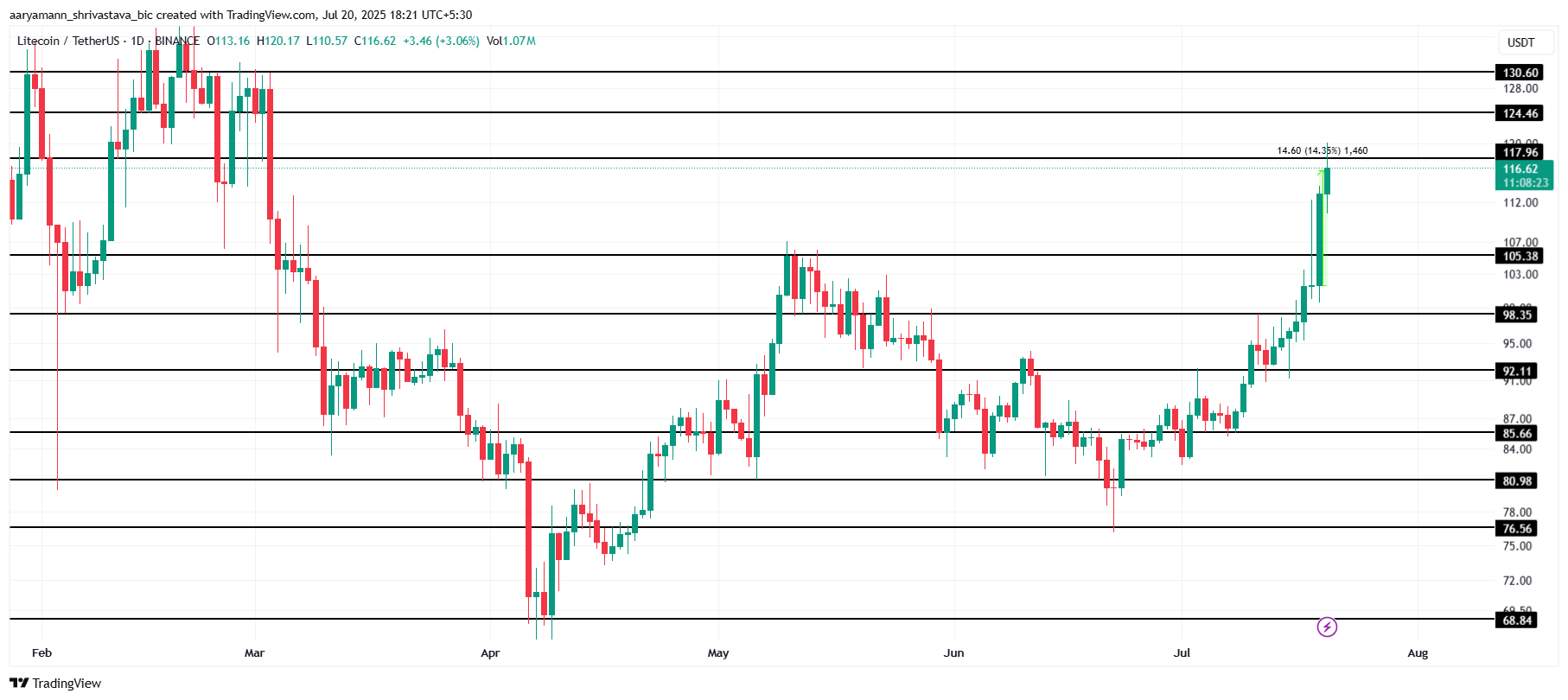 Litecoin กำลังเป็นข่าวอีกครั้งด้วยการกระโดดของราคาถึง 14% โดยซื้อขายที่ 116 USD หลังจากมีแนวโน้มขาขึ้นอย่างต่อเนื่องในหลายวัน การพุ่งขึ้นล่าสุดนี้สอดคล้องกับการฟื้นตัวของตลาดคริปโตที่กว้างขึ้นและสัญญาณที่เพิ่มขึ้นของฤดูกาล altcoin ที่กำลังจะมาถึง