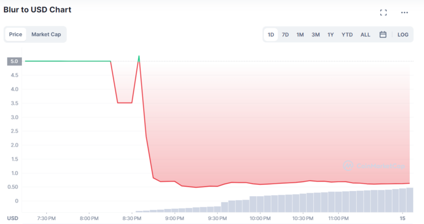 ณ เวลานี้ ราคาของ BLUR ลดลงกว่า 80% เป็น 0.63 ดอลลาร์สหรัฐจากระดับสูงสุดตลอดกาลที่ 5.01 ดอลลาร์สหรัฐ ซึ่งเกิดขึ้นก่อนการปลดล็อก