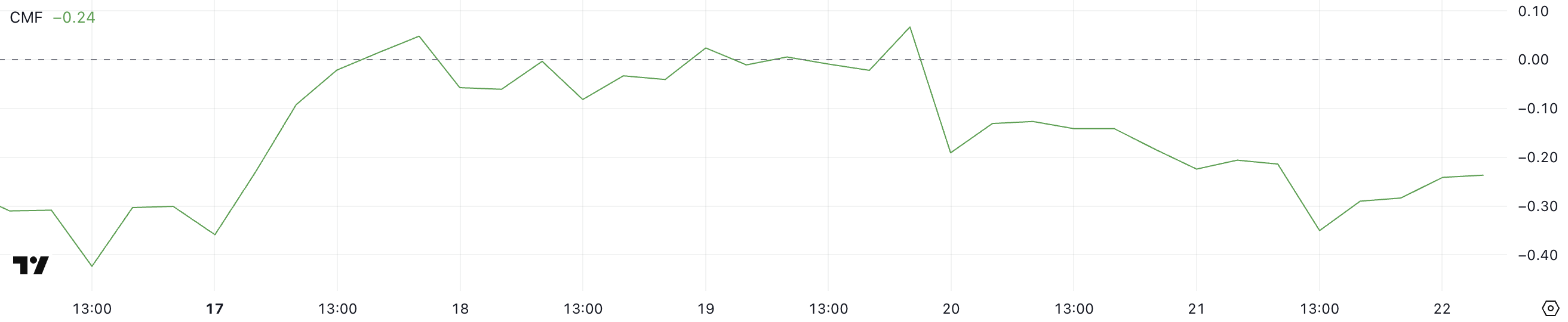 แม้ว่า RSI ของ MNT จะฟื้นตัวขึ้นมาที่ 39.9 แต่ยังคงอยู่ในเขตขาลง สะท้อนถึงความระมัดระวัง นอกจากนี้ Chaikin Money Flow (CMF) ของ MNT กำลังพยายามฟื้นตัวแต่ยังคงติดลบอย่างมาก ขณะที่เส้นค่าเฉลี่ยเคลื่อนที่แบบเอ็กซ์โพเนนเชียล (EMA) บ่งชี้ถึงแนวโน้มขาลงที่ยังคงอยู่