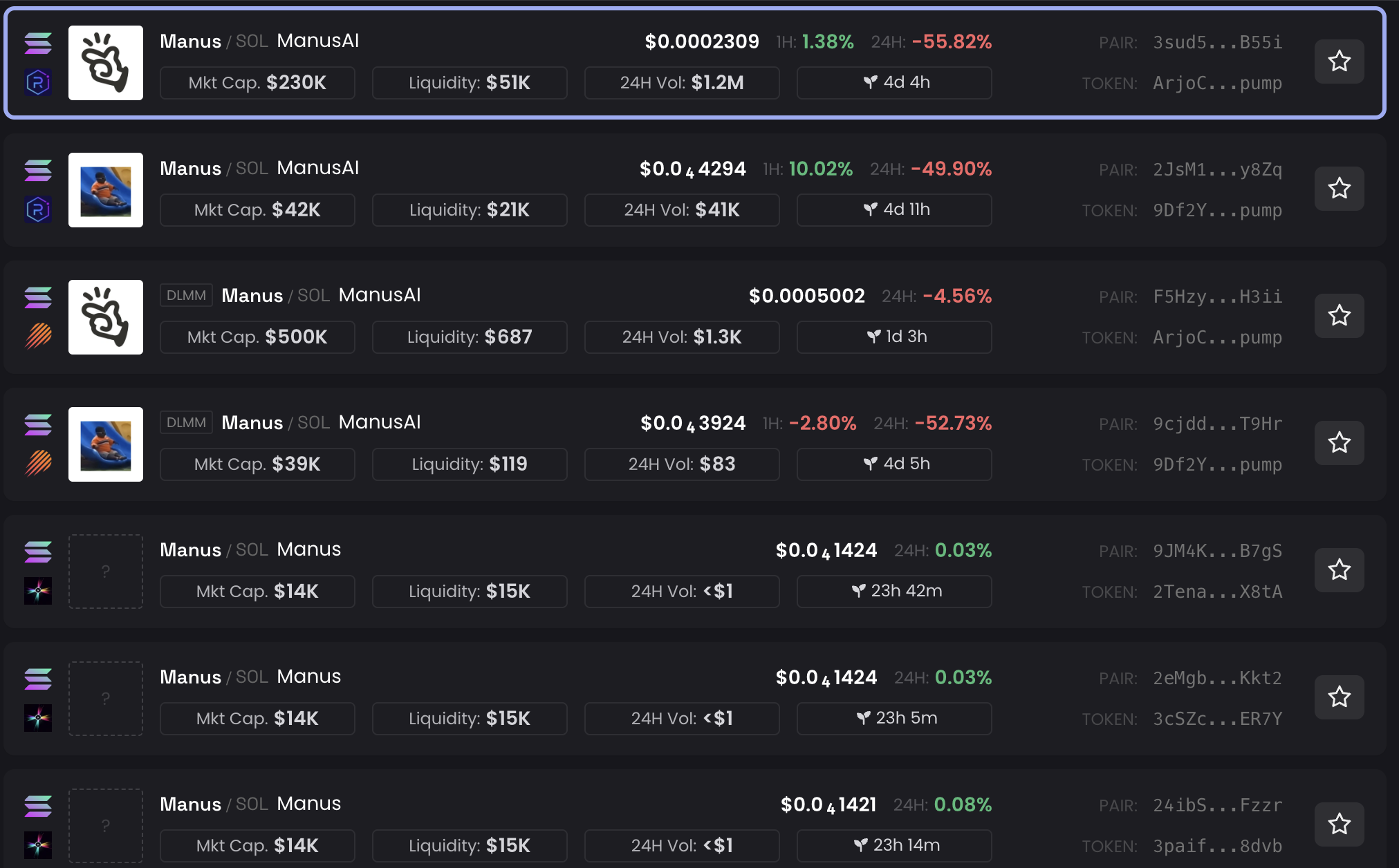 แม้ว่าแถลงการณ์ของ Ji จะพยายามแก้ไขความเข้าใจผิด แต่ตลาดคริปโตกลับแสดงภาพที่แตกต่างออกไป โทเค็นหลายตัวที่ใช้ชื่อ “Manus” ได้ปรากฏบน การแลกเปลี่ยนแบบกระจายอำนาจ (DEX) บางโทเค็นเปิดตัวในวันเดียวกับโครงการ ขณะที่บางโทเค็นเพิ่งเปิดตัวเพียงวันหรือไม่กี่ชั่วโมง