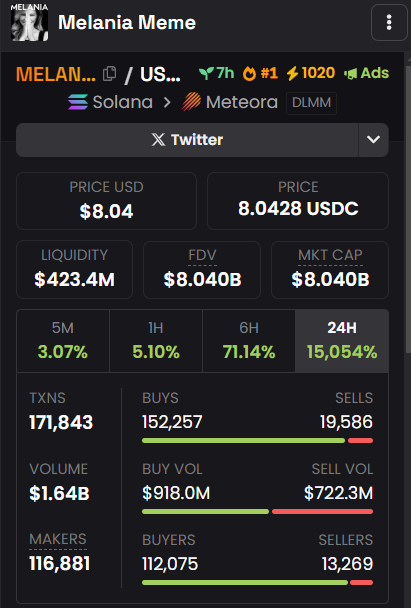 ภายในไม่กี่ชั่วโมงหลังจากเปิดตัว MELANIA มีมูลค่าถึงกว่า 8 พันล้าน USD ทำให้เกิดความตื่นเต้นและความสงสัยในชุมชนคริปโต