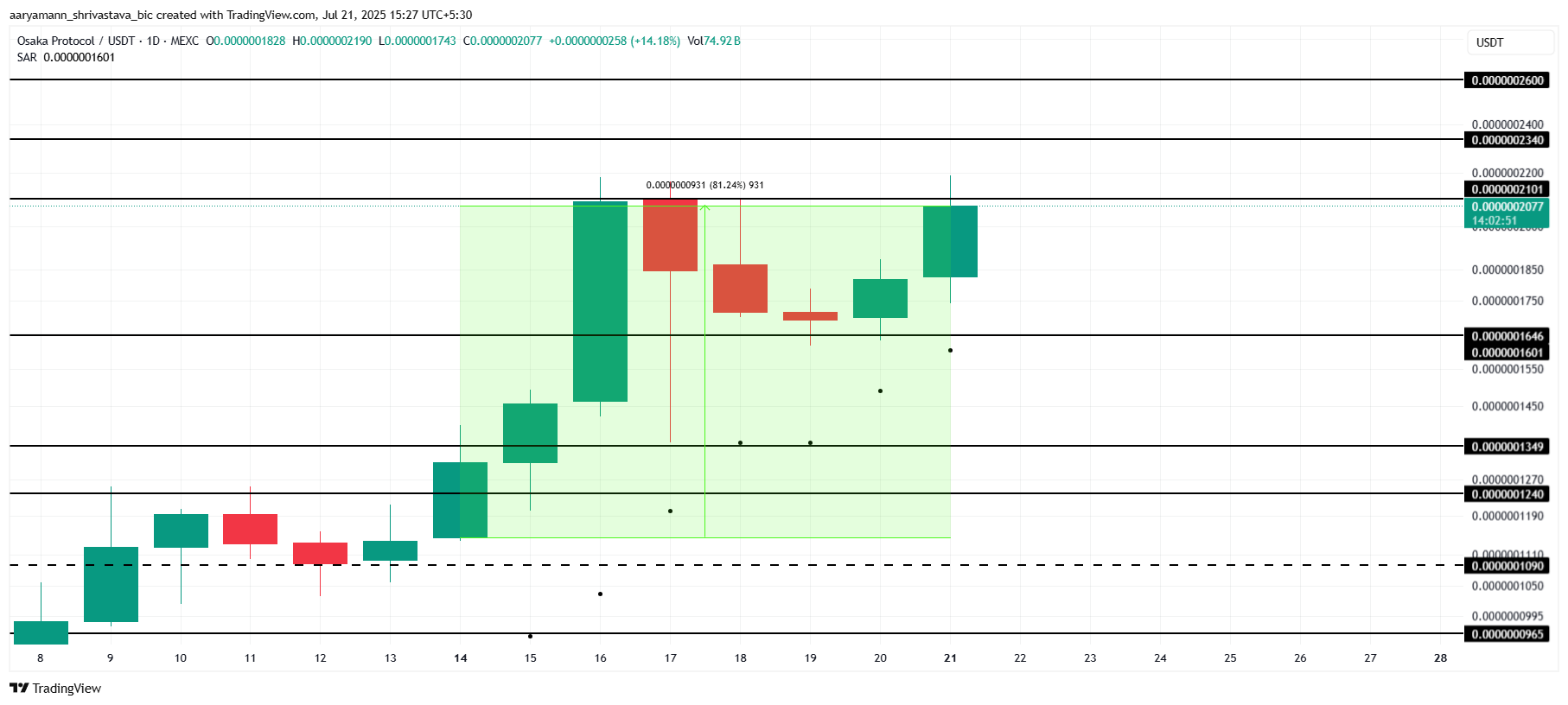 อย่างไรก็ตาม หาก OSAK ไม่สามารถทะลุแนวต้านที่ $0.0000002101 หรือพบแรงกดดันขาลง อาจถอยกลับ การลดลงไปที่ $0.0000001646 จะทำให้ทฤษฎีขาขึ้นในปัจจุบันเป็นโมฆะ ส่งสัญญาณการกลับตัวของแนวโน้ม