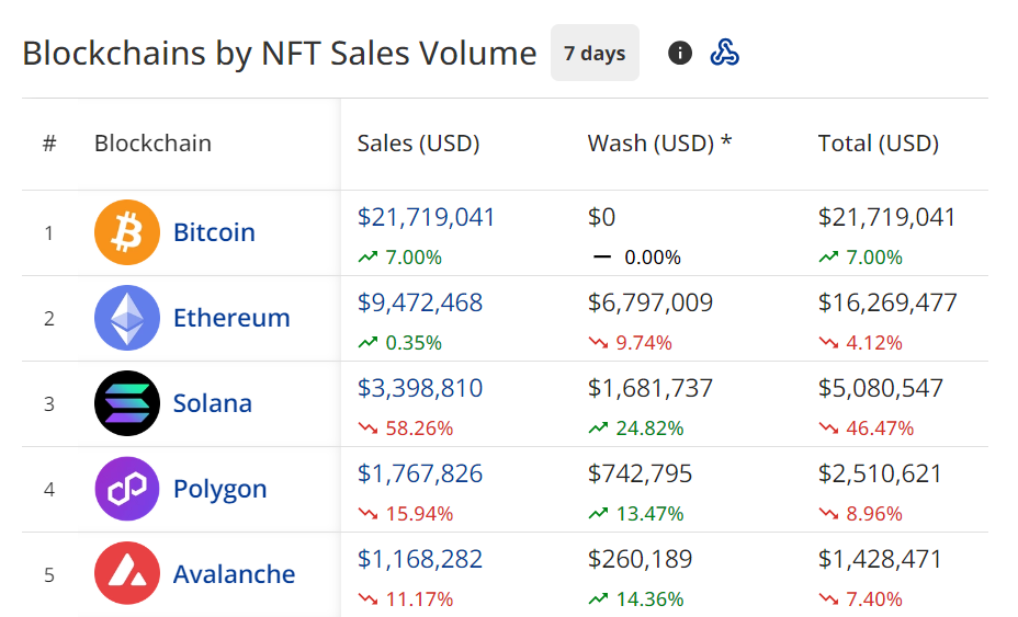 ความสําเร็จของ PUPS สะท้อนให้เห็นถึงเทรนด์ที่ใหญ่กว่า ในช่วงสัปดาห์ที่ผ่านมา ปริมาณการขาย NFT บนบล็อกเชน Bitcoin แซงหน้า Ethereum และ Solana ไปได้ เรื่องนี้เป็นที่น่าสนใจเพราะโดยปกติแล้ว Ethereum และ Solana จะเป็นที่รู้จักกันดีในเรื่อง NFT